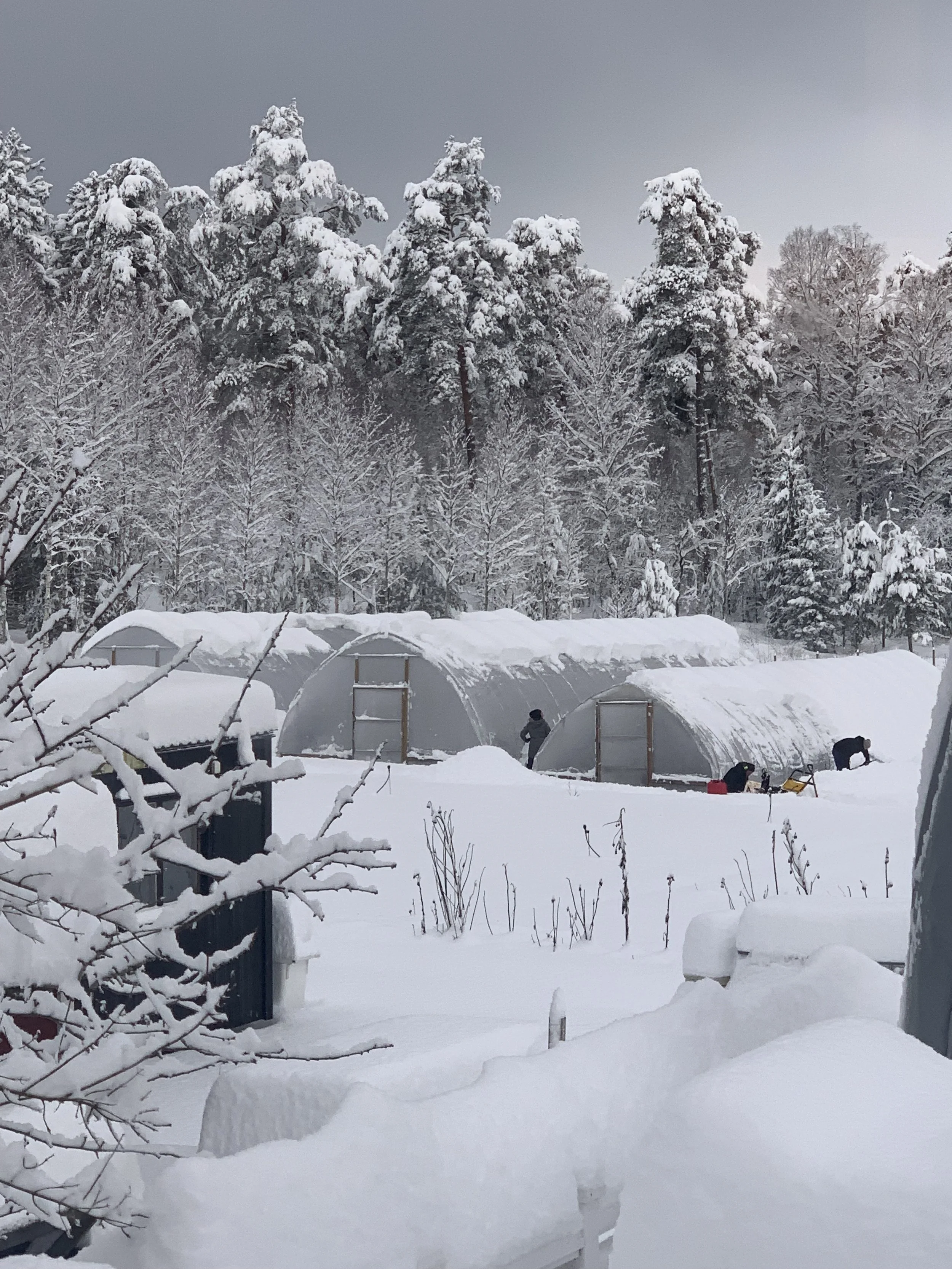 Herregud vad det har snöat hos oss! Vårt nybyggda uppdrivningsväxthus har kollapsat under snömängderna av en natts snöfall och våra tre tunnelväxthus har vi under flera dagars tid långsamt skottat fram ur drivorna. Över två meter snö låg mellanväxthusens långsidor och måste bort innan det trycker sönder växthusen med sin tyngd.